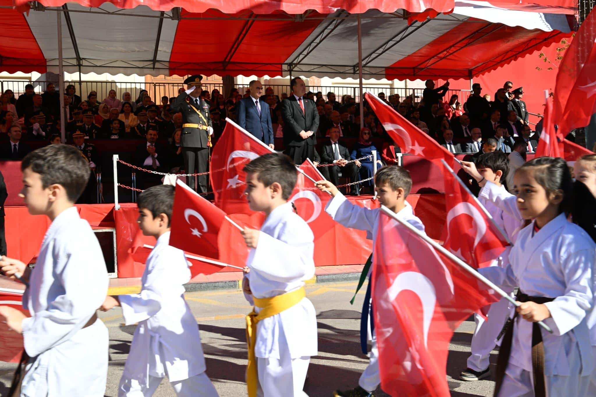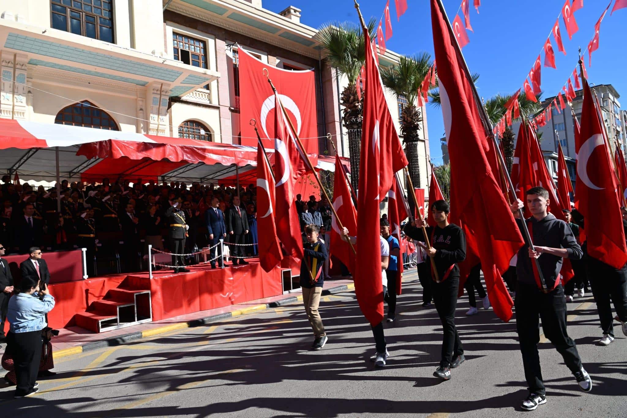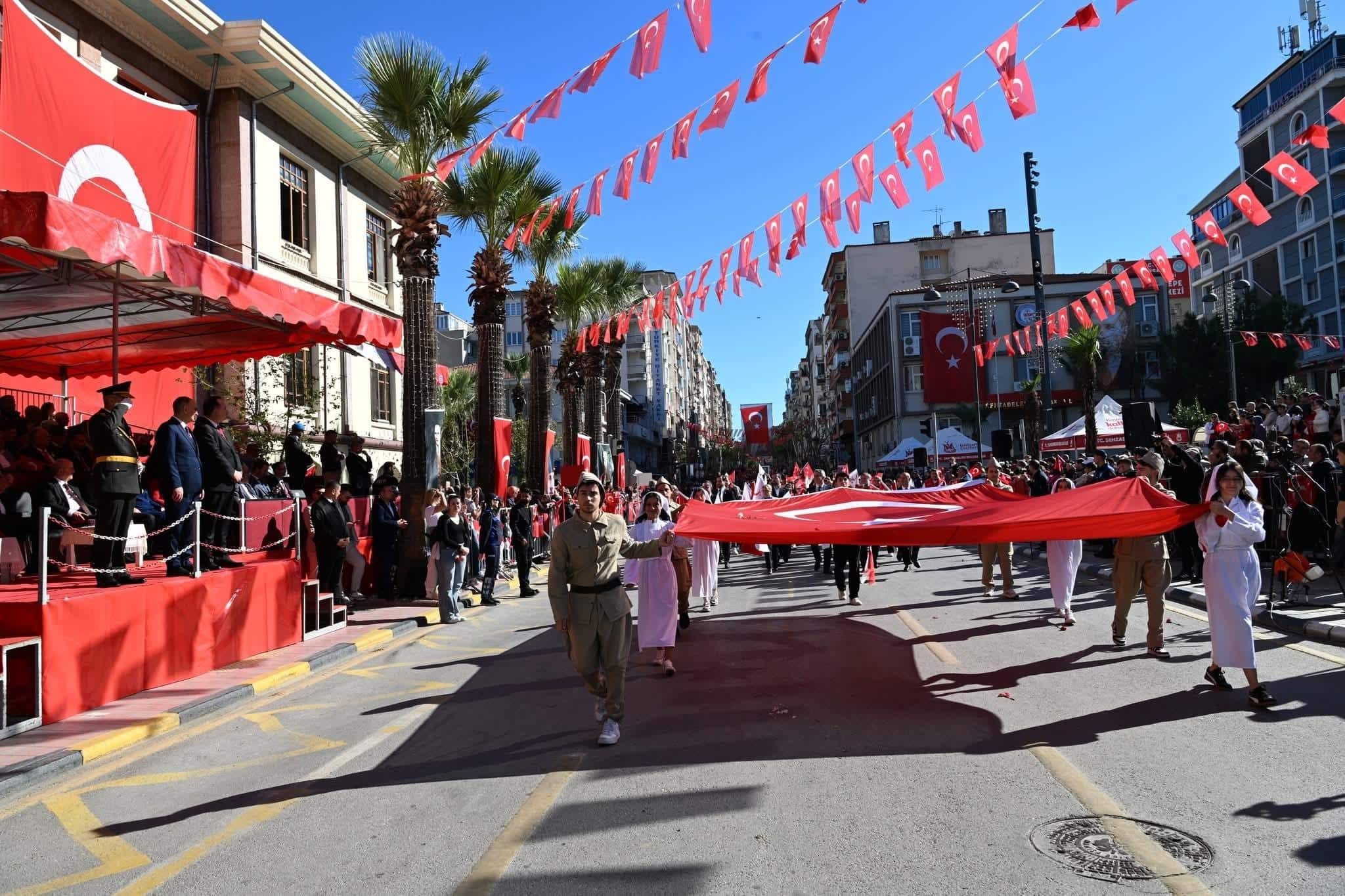 Programın sonunda öğrenciler, öğretmenler, sporcular ve çeşitli kurumların bayraklarla gerçekleştirdikleri geçit töreni Cumhuriyet coşkusunu en güçlü şekilde yaşattı.