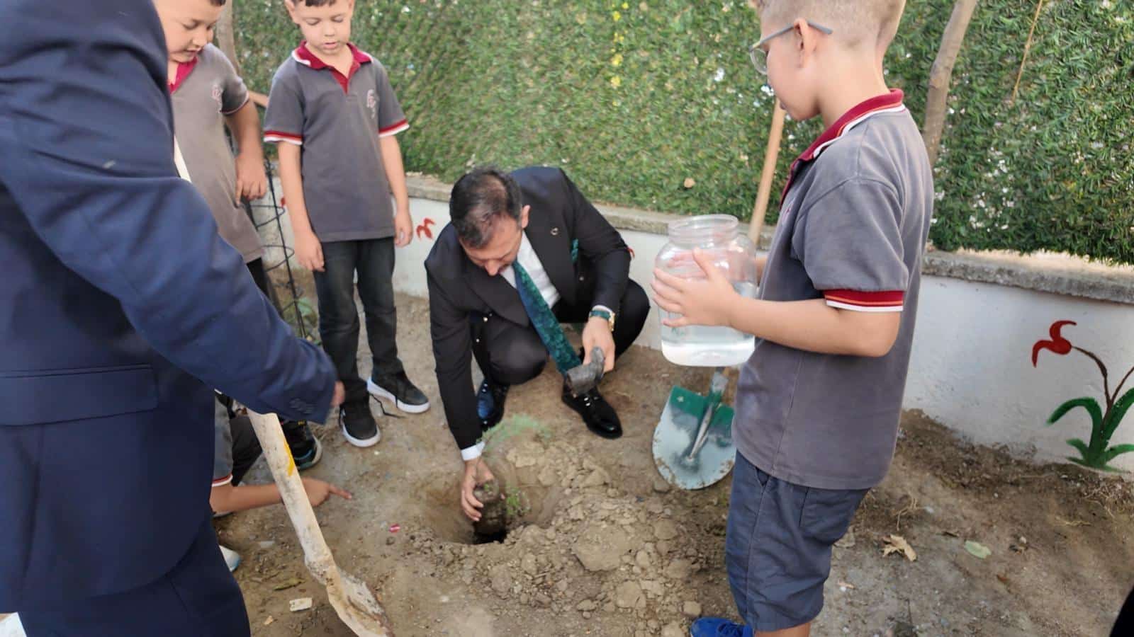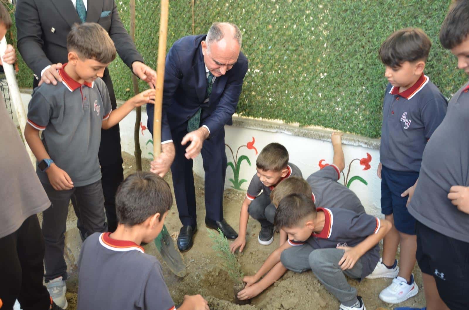Programın bitimini müteakip Sayın Valimiz ve İl Müdürümüz, öğrencilerle beraber okul bahçesine fidan dikerek fidanlara can suyu verdi.